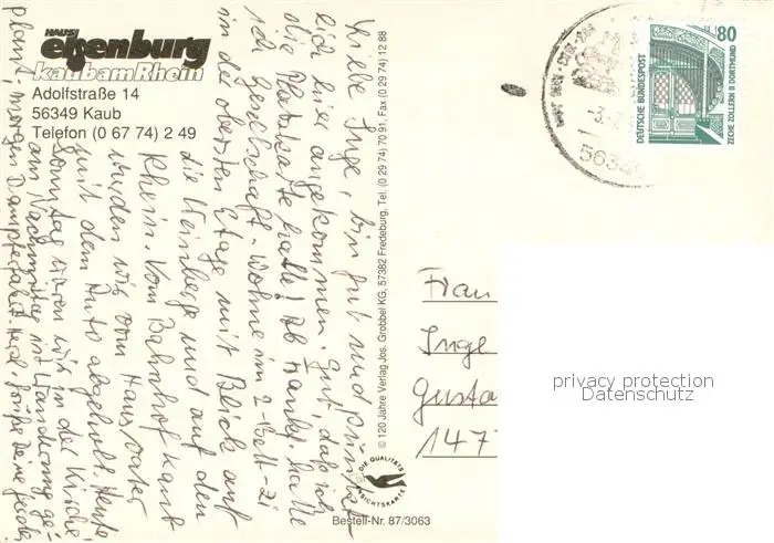 Kaub_Rhein Haus Elsenburg Panorama Terrasse Rheinpartie Kaub_Rhein postalisch gelaufen nach 1965 Erhaltung siehe scans [WerneD78] WernPID7
