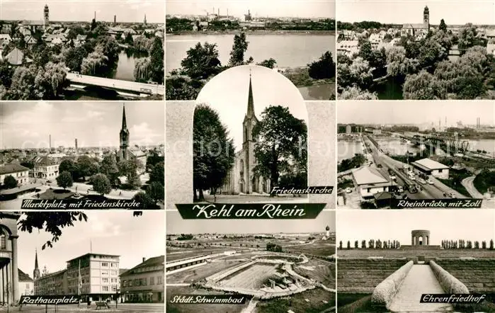 AK / Ansichtskarte Kehl_Rhein Panorama Marktplatz Friedenskirche Rheinbruecke mit Zoll Rathausplatz Staedt Schwimmbad Ehrenfriedhof Kehl_Rhein