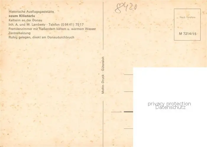Kelheim_Donau Ausflugsgaststaette Zum Kloesterle Gastraeume postalisch nicht gelaufen nach 1965 Erhaltung siehe scans [WerneD78] WernPID7