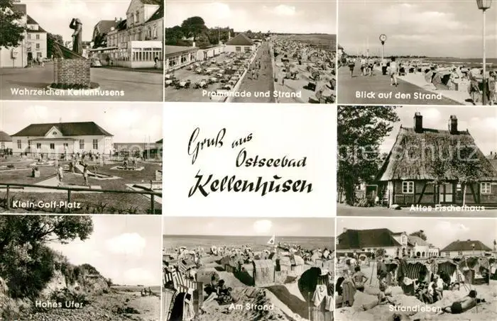 AK / Ansichtskarte Kellenhusen_Ostseebad Wahrzeichen Promenade Strand Minigolf Altes Fischerhaus Hohes Ufer Strandleben Kellenhusen_Ostseebad