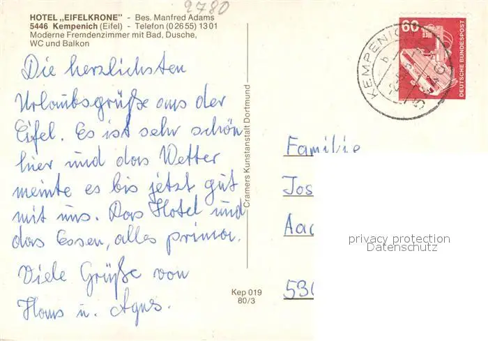 Kempenich Kategorie Alte Ansichtskarten Postkarten bx45595 Kempenich Hotel Eifelkrone Kempenich postalisch gelaufen 1985 Erhaltung siehe scans [LiesaD40]