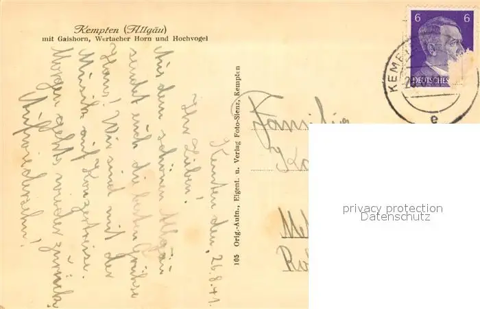 Kempten_Allgaeu mit Gaishorn Wertacher Horn und Hochvogel Kempten Allgaeu postalisch gelaufen 1941 Erhaltung siehe scans [WerneD78] WernPID7