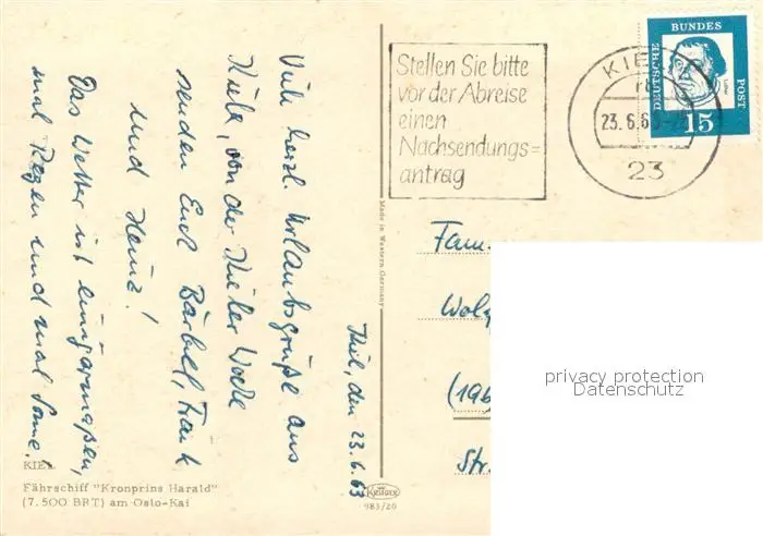 Kiel Faehrschiff Kronprinz Harald Kiel postalisch gelaufen 1963 Erhaltung siehe scans [WerneD78] WernPID7