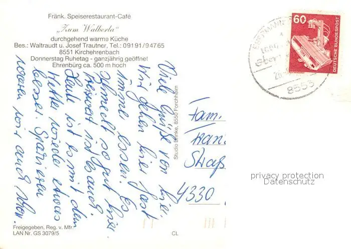 Kirchehrenbach Kategorie Alte Ansichtskarten Postkarten bx45914 Kirchehrenbach Restaurant Cafe zum Walberla Kirchehrenbach postalisch gelaufen nach 1965 Erhaltung siehe scans [LiesaD40]