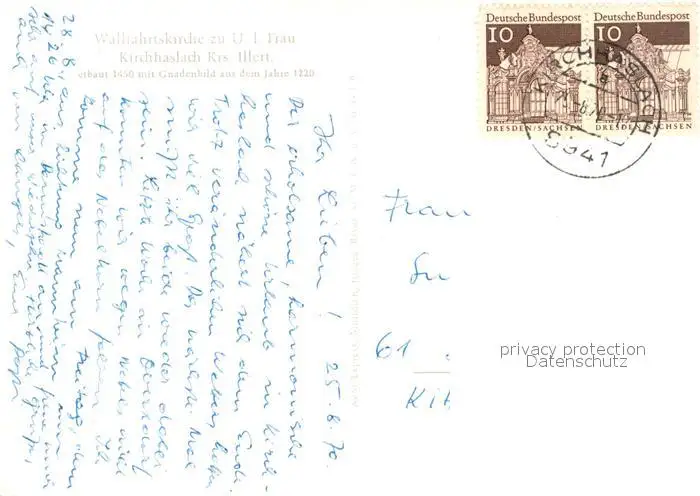 Kirchhaslach Kategorie Alte Ansichtskarten Postkarten bx75048 Kirchhaslach Fliegeraufnahme Wallfahrtskirche Kirchhaslach postalisch gelaufen 1970 Erhaltung siehe scans [KathaD81]