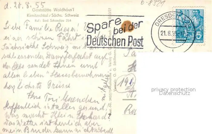 Kirnitzschtal Gaststaette Waldhaeusl Kirnitzschtal postalisch gelaufen 1955 Erhaltung siehe scans [WerneD78] WernPID7