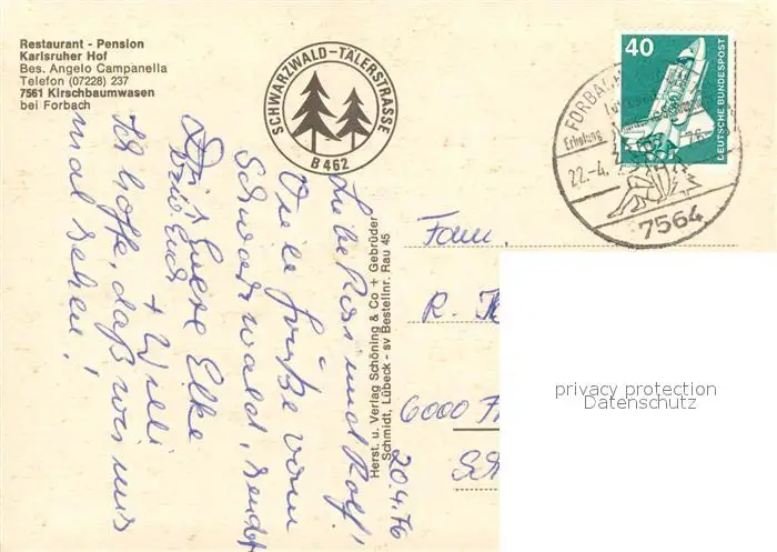Kirschbaumwasen Restaurant Karlsruher Hof Kirschbaumwasen postalisch gelaufen 1976 Erhaltung siehe scans [NatalD47] NataID47