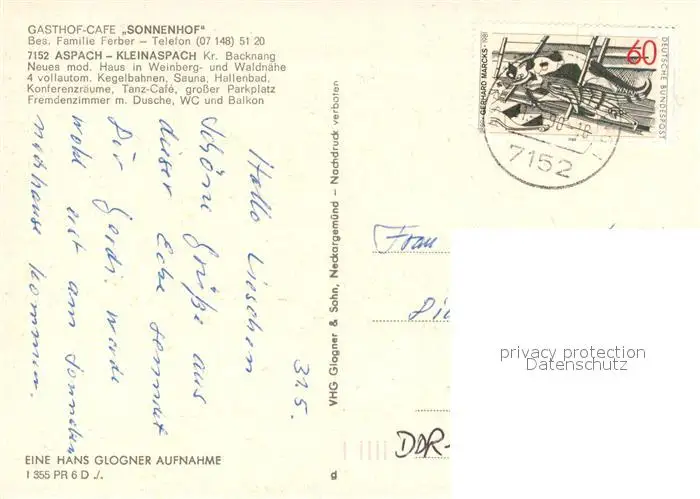 Kleinaspach Sonnenhof Gasthof Cafe Hallenbad Bar Kleinaspach postalisch gelaufen 1990 Erhaltung siehe scans [WerneD78] WernPID7