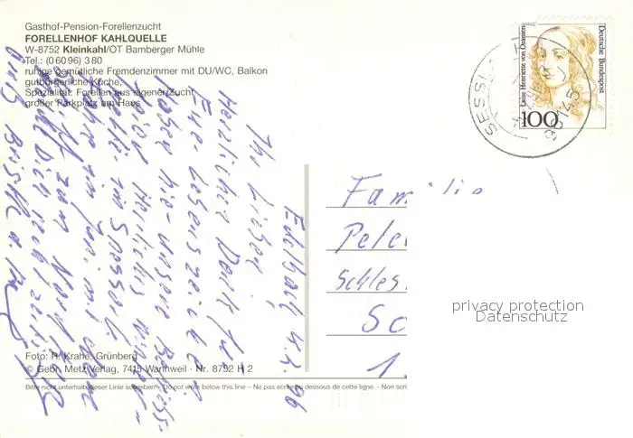 Kleinkahl Gasthof Pension Forellenhof Kahlquelle Freibad Fischteiche Kleinkahl postalisch gelaufen 1996 Erhaltung siehe scans [WerneD78] WernPID7