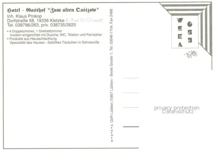 Kletzke Hotel Gasthof Zum alten Quitzow Kirche Storchennest Kletzke postalisch nicht gelaufen nach 1965 Erhaltung siehe scans [FriedD77] Frierer