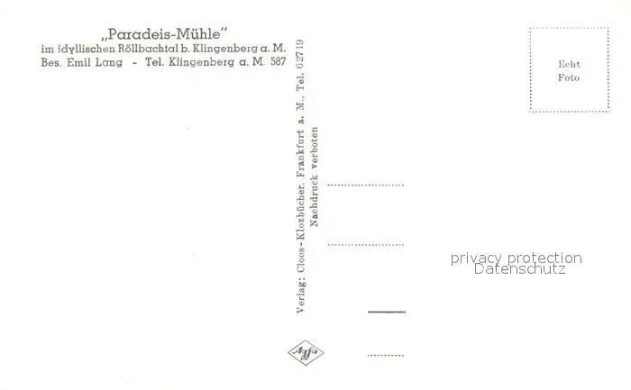 Klingenberg_Main Paradeis Muehle Es klappert die Muehle Klingenberg Main postalisch nicht gelaufen 1921-1965 Erhaltung siehe scans [KathaD81] Kathoren