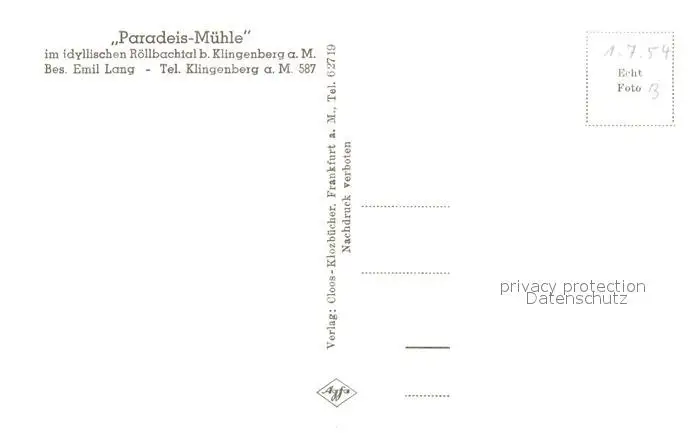 Klingenberg Main Kategorie Alte Ansichtskarten Postkarten bx54325 Klingenberg_Main Paradeis Muehle Klingenberg Main postalisch nicht gelaufen Erhaltung siehe scans [NatalD47]