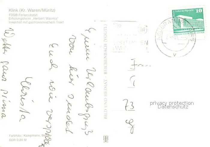 Klink_Waren FDGB Ferienobjekt Erholungsheim Herbert Warnke Klink Waren postalisch gelaufen 1981 Erhaltung siehe scans [FriedD77] Frierer