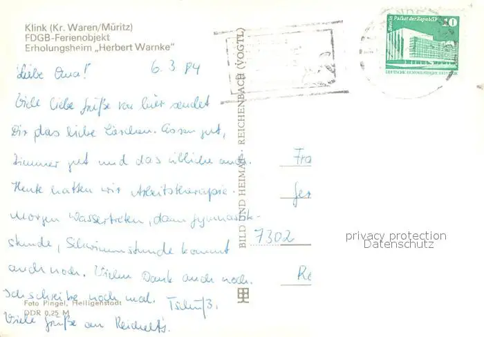 Klink_Waren FDGB-Ferienobjekt Erholungsheim Herbert Warnke Klink Waren postalisch gelaufen 1984 Erhaltung siehe scans [LiesaD40] LiesID40