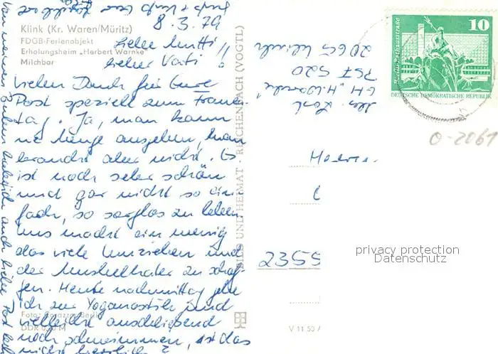Klink_Waren FDGB Ferienobjekt Erholungsheim Herbert Warnke Milchbar Klink Waren postalisch gelaufen 1979 Erhaltung siehe scans [FriedD77] Frierer
