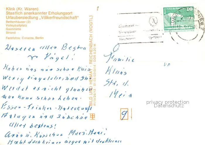 Klink_Waren Urlaubersiedlung Voelkerfreundschaft Bettenhaeuser Volleyballplatz Gaststaette Strand Klink Waren postalisch gelaufen ca. 1985 Erhaltung siehe scans [FriedD77] Frierer