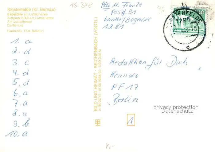 Klosterfelde Badestelle Lottschesee Zeltplatz Bootsliegeplatz Dorfkirche Klosterfelde postalisch gelaufen 1989 Erhaltung siehe scans [WerneD78] WernPID7