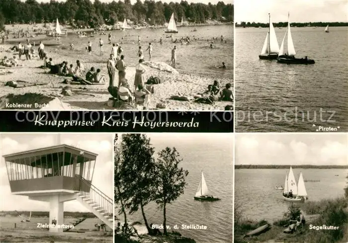 AK / Ansichtskarte Knappensee_Oberlausitz Koblenzer Bucht Segelboot Segelkutter Steilkueste Zielrichterturm Knappensee_Oberlausitz