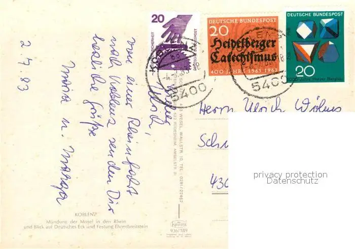 Koblenz_Rhein Moselmuendung mit Deutschem Eck und Festung Ehrenbreitstein Fliegeraufnahme Koblenz_Rhein postalisch gelaufen 1983 Erhaltung siehe scans [WerneD78] WernPID7