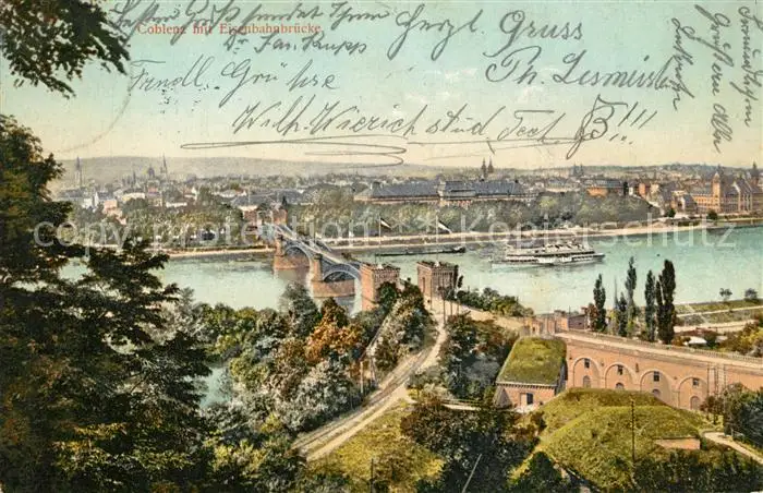 Koblenz_Rhein Panorama Eisenbahnbruecke Koblenz_Rhein postalisch gelaufen 1910 Erhaltung siehe scans [KathaD81] Kathoren