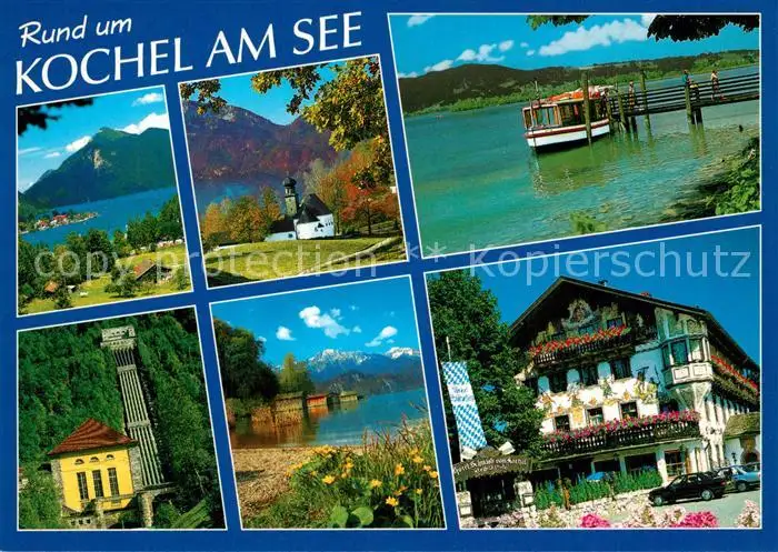 AK / Ansichtskarte Kochel_See Walchensee Jochberg Ev Kirche Bootsanlegestelle Walchensee Kraftwerk Bootshaeuser Ortsansicht Kochel_See