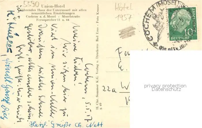 Kochem Union-Hotel mit Terrasse Kochem postalisch gelaufen 1957 Erhaltung siehe scans [LiesaD40] LiesID40