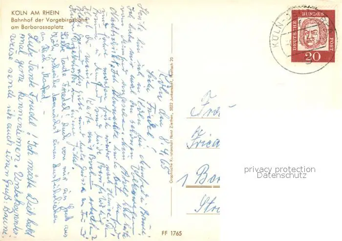 Koeln_Rhein Bahnhof der Vorgebirgsbahn am Barbarossaplatz Koeln_Rhein postalisch gelaufen 1965 Erhaltung siehe scans [WerneD78] WernPID7