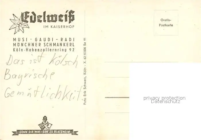 Koeln_Rhein Edelweiss im Kaiserhof Muenchner Schmankerl Koeln_Rhein postalisch nicht gelaufen 1921-1965 Erhaltung siehe scans [FriedD77] Frierer