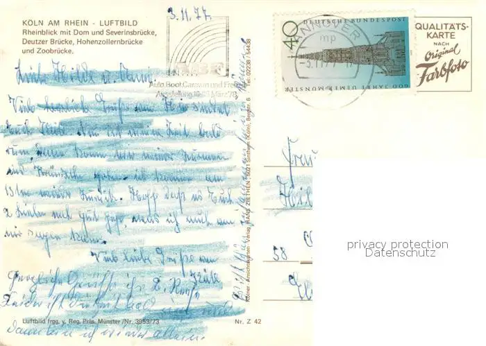 Koeln_Rhein Fliegeraufnahme Rhein mit Dom und Severinsbruecke Deutzer-Bruecke Hohenzollernbruecke Zoobruecke Koeln_Rhein postalisch gelaufen 1977 Erhaltung siehe scans [LiesaD40] LiesID40