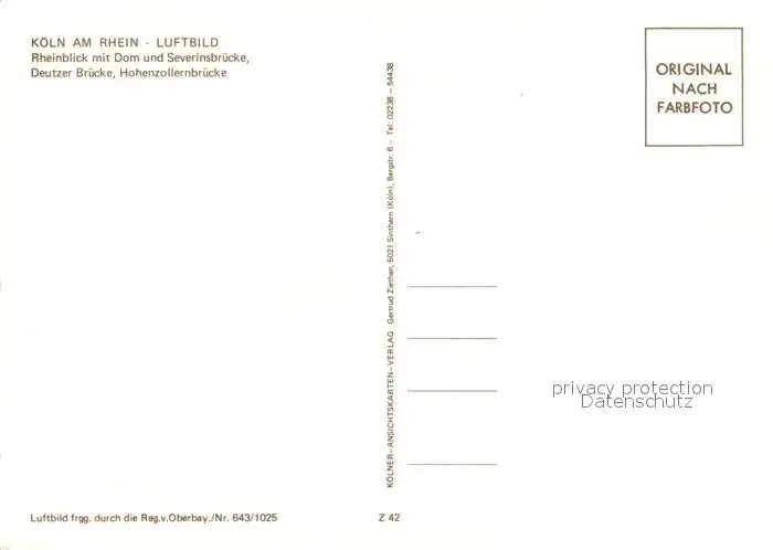 Koeln_Rhein Fliegeraufnahme mit Rhein Dom und Severinsbruecke Deutzer Bruecke und Hohenzollernbruecke Koeln_Rhein postalisch nicht gelaufen nach 1965 Erhaltung siehe scans [WerneD78] WernPID7
