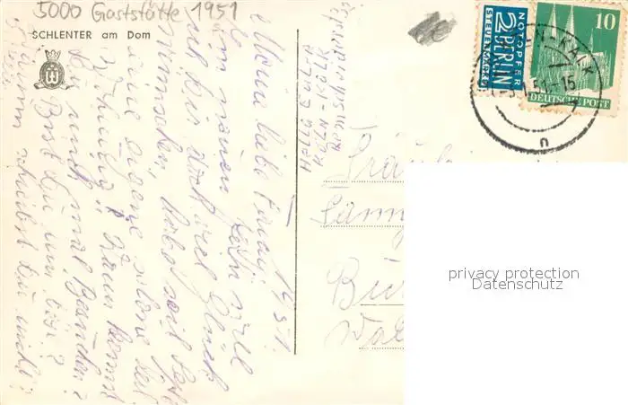 Koeln_Rhein Gaststaette Schlenter am Dom Koeln_Rhein postalisch gelaufen 1951 Erhaltung siehe scans [WerneD78] WernPID7