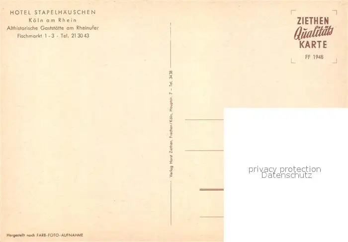 Koeln_Rhein Kategorie Alte Ansichtskarten Postkarten bx45563 Koeln_Rhein Hotel Stapelhaeuschen Koeln_Rhein postalisch nicht gelaufen nach 1965 Erhaltung siehe scans [LiesaD40]