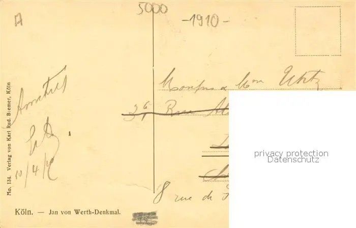 Koeln_Rhein Jan von Werth Denkmal Koeln_Rhein postalisch gelaufen 1910 Erhaltung siehe scans [WerneD78] WernPID7