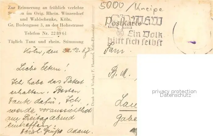 Koeln_Rhein Kneipe Budenecker Schlossberg Winzerdorf und Waldschenke Koeln_Rhein postalisch gelaufen 1937 Erhaltung siehe scans [LiesaD40] LiesID40