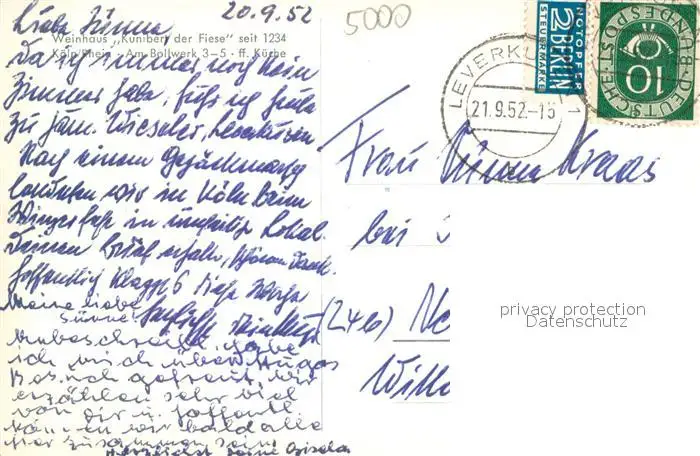 Koeln_Rhein Weinhaus Kuniberg der Fiese Koeln_Rhein postalisch gelaufen 1952 Erhaltung siehe scans [WerneD78] WernPID7