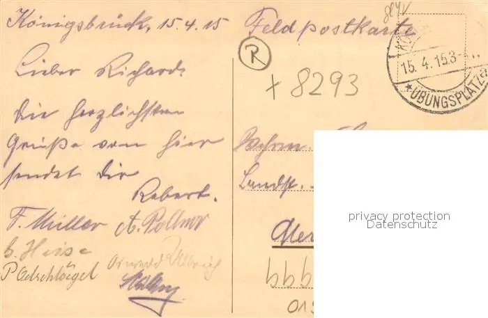 Koenigsbrueck Truppenuebungsplatz Kgl Kommandantur Koenigsbrueck postalisch gelaufen 1915 Feldpost Erhaltung siehe scans [FriedD77] Feldpost Frierer