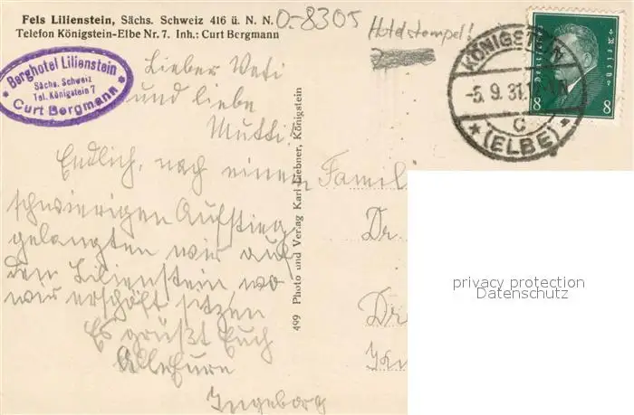 Koenigstein_Saechsische_Schweiz Gesamtansicht mit Fels Lilienstein Berghotelstempel Koenigstein_Saechsische postalisch gelaufen 1931 Erhaltung siehe scans [LiesaD40] LiesID40