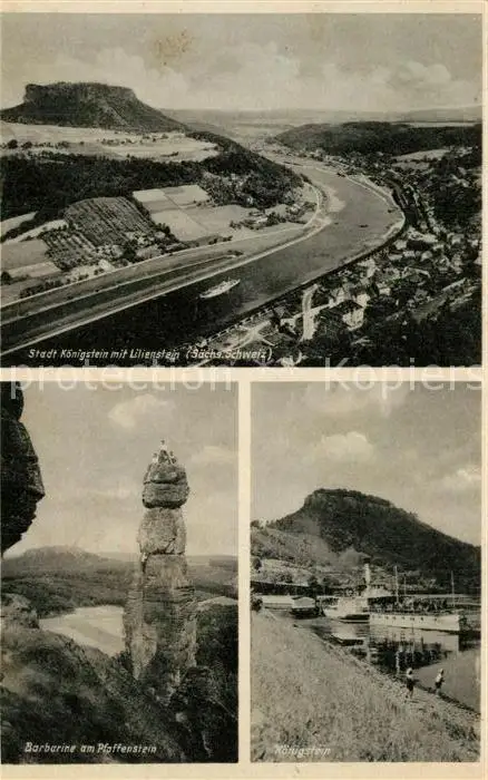 AK / Ansichtskarte Koenigstein_Saechsische_Schweiz mit Lilienstein und Elbe Barbarine am Pfaffenstein Festung Koenigstein_Saechsische