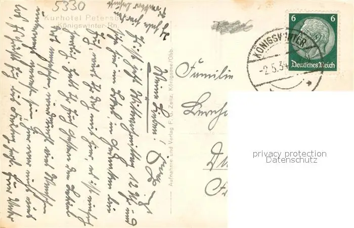 Koenigswinter Kurhotel Petersberg Terrasse Blick ins Siebengebirge Koenigswinter postalisch gelaufen 1934 Erhaltung siehe scans [FriedD77] Frierer