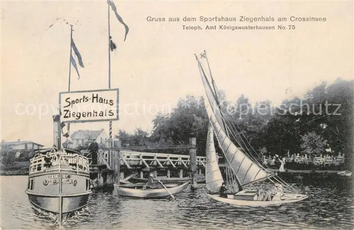AK / Ansichtskarte Koenigswusterhausen Sportshaus Ziegenhals am Crossinsee Bootsanleger Dampfer Segelboot Koenigswusterhausen