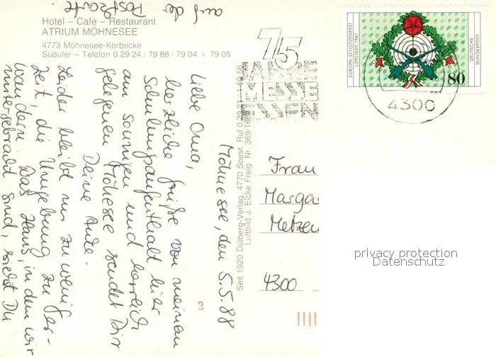 Koerbecke_Moehnesee Hotel Cafe Restaurant Atrium Moehnesee Fliegeraufnahme Koerbecke Moehnesee postalisch gelaufen 1988 Erhaltung siehe scans [FriedD77] Frierer