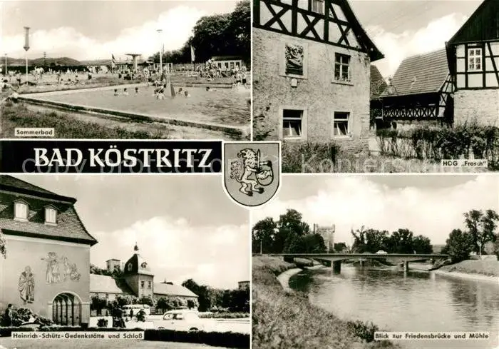 AK / Ansichtskarte Koestritz_Bad Schloss Schwimmbad Friedensbruecke Muehle HOG Frosch Koestritz_Bad