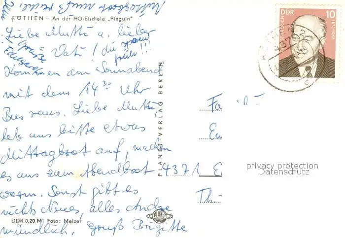 Koethen Anhalt Kategorie Alte Ansichtskarten Postkarten bx62417 Koethen_Anhalt HO Eisdiele PInguin Koethen Anhalt postalisch gelaufen nach 1965 Erhaltung siehe scans [KathaD81]