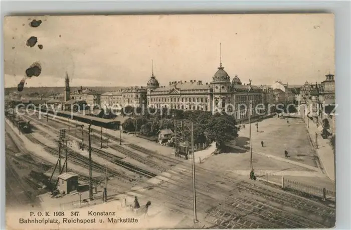 Konstanz_Bodensee Bahnhofsplatz Reichspost Marktstaette Konstanz_Bodensee postalisch gelaufen 1908 Erhaltung siehe scans [FriedD77] Frierer