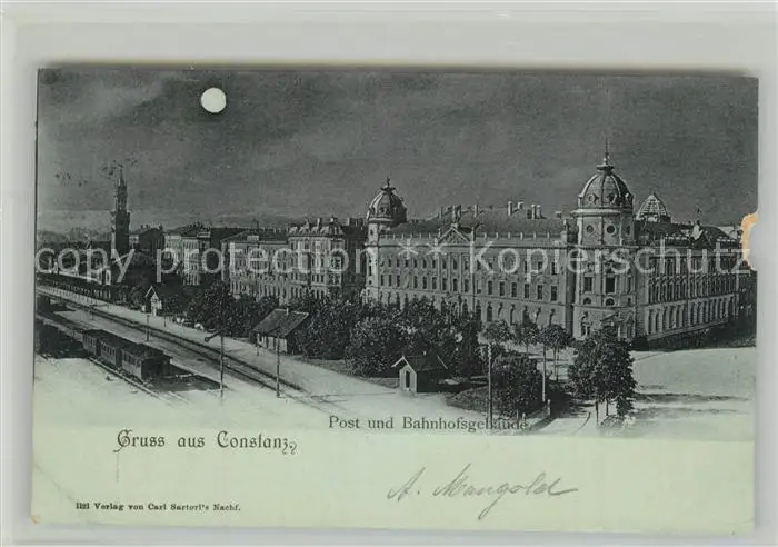 Konstanz_Bodensee Post und Bahnhofsgebaeude im Mondschein Konstanz_Bodensee postalisch gelaufen 1898 Erhaltung siehe scans [FriedD77] Frierer