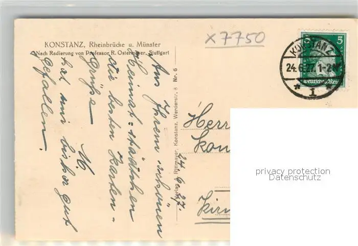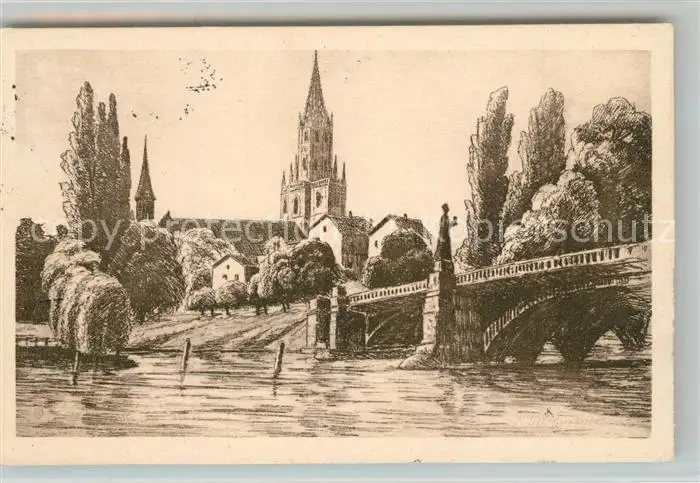 Konstanz_Bodensee Rheinbruecke und Muenster Radierung Prof. Ostermayer Kuenstlerkarte Konstanz_Bodensee postalisch gelaufen 1927 Erhaltung siehe scans [FriedD77] Frierer