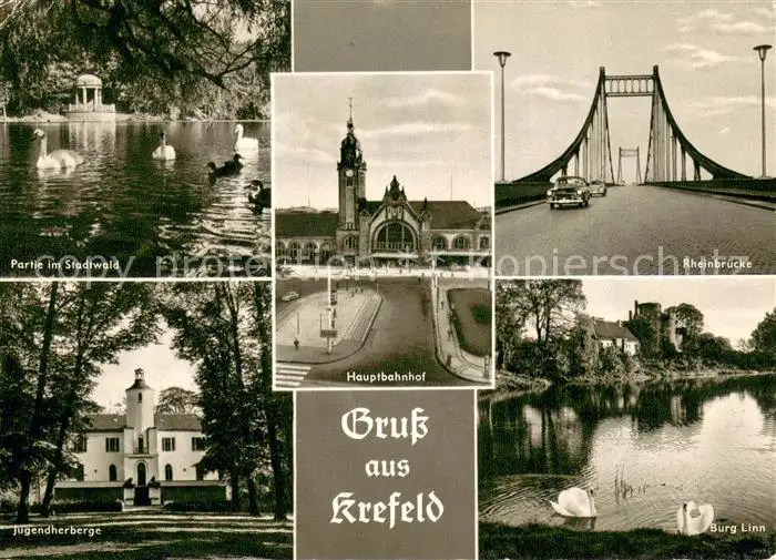 AK / Ansichtskarte Krefeld_Rhein Partie im Stadtwald Hauptbahnhof Rheinbruecke Jugendherberge Burg Linn