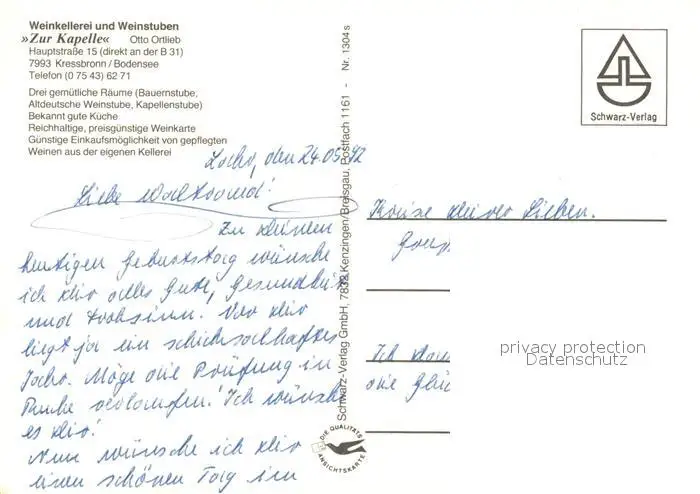 Kressbronn_Bodensee Weinkellerei Weinstuben Zur Kapelle Kressbronn Bodensee postalisch nicht gelaufen 1992 Erhaltung siehe scans [FriedD77] Frierer