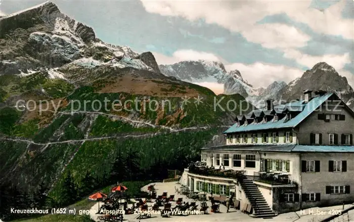 AK / Ansichtskarte Kreuzeckhaus mit Alpspitze Zugspitze und Waxenstein Kreuzeckhaus