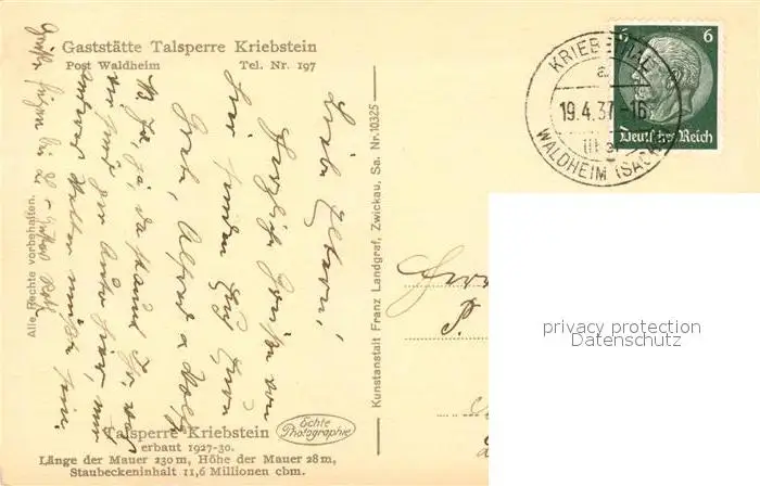 Kriebstein Talsperre Sperrmauer Gaststaette Motorboote Schloss Kriebstein postalisch gelaufen 1937 Erhaltung siehe scans [FriedD77] Frierer